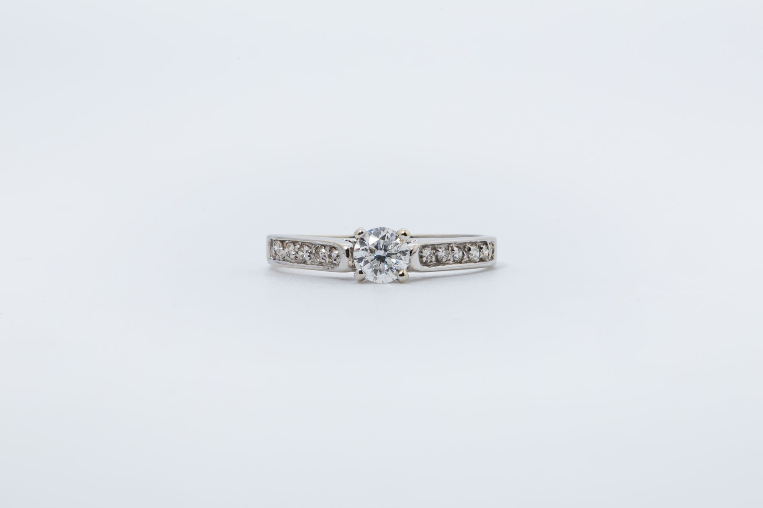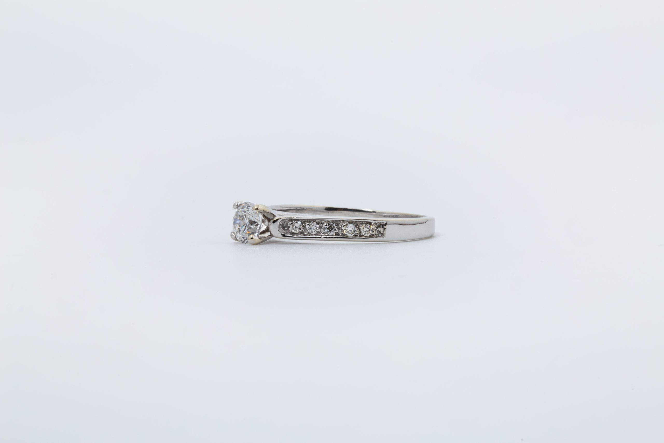 Anillo de compromiso en oro blanco 14K con diamante central de mina 39 pts y diamantes laterales de mina 10 pts