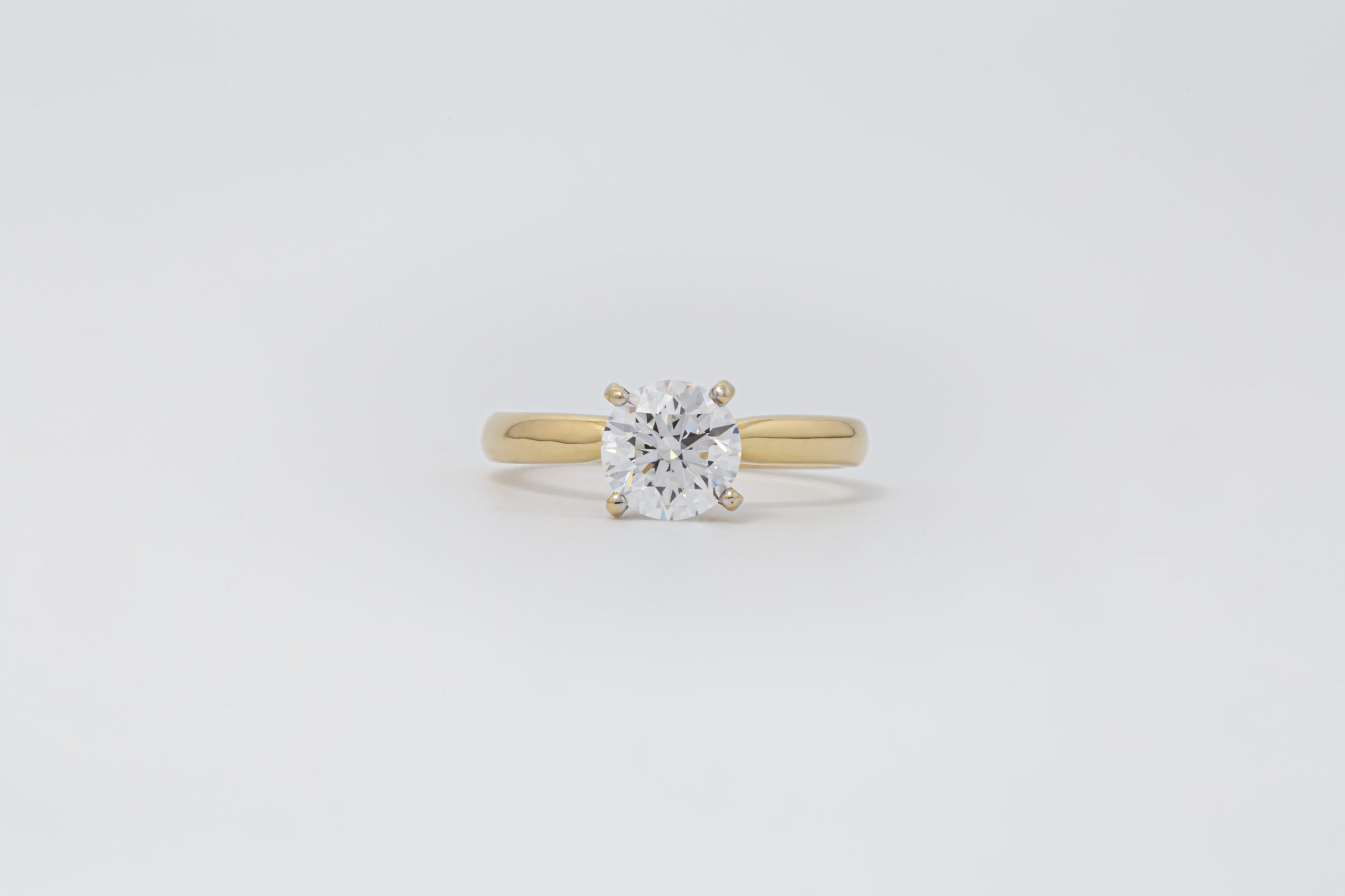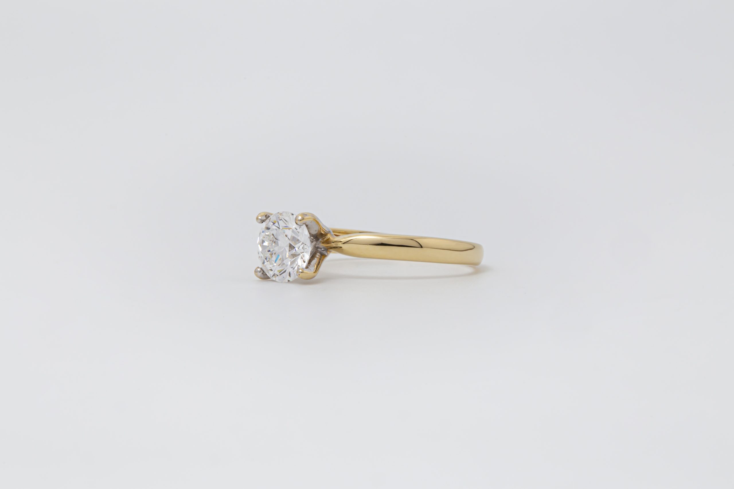 Este anillo de compromiso está elaborado en oro amarillo 14K, una aleación clásica que aporta calidez y sofisticación, y engastado con un imponente diamante Lab Grown certificado por GIA de 1.26 quilates.