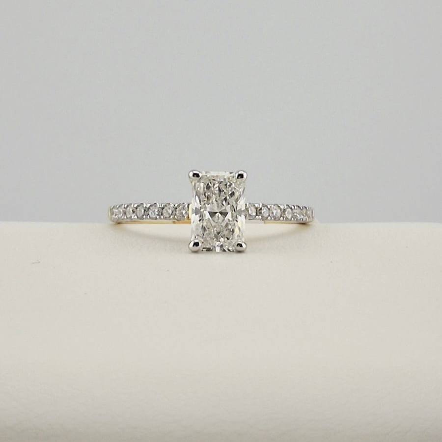 Este anillo de compromiso en oro amarillo 14K es una declaración de amor moderno y sofisticado. Su protagonista es un diamante Lab Grown de 1 quilate, tallado en corte Radiant, una forma reconocida por combinar la elegancia del corte esmeralda con el brillo intenso del corte brillante.