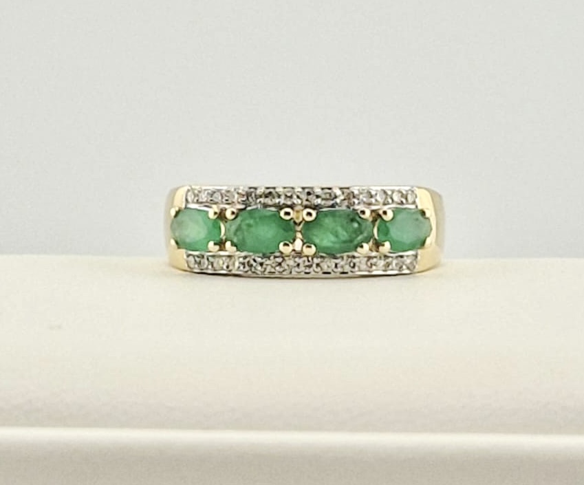 Este fashion ring en oro amarillo 14K es una joya vibrante que combina lujo, color y sofisticación. Su diseño resalta con cuatro esmeraldas naturales que suman 90 puntos, reconocidas por su intenso tono verde y su simbolismo de renovación y prosperidad.