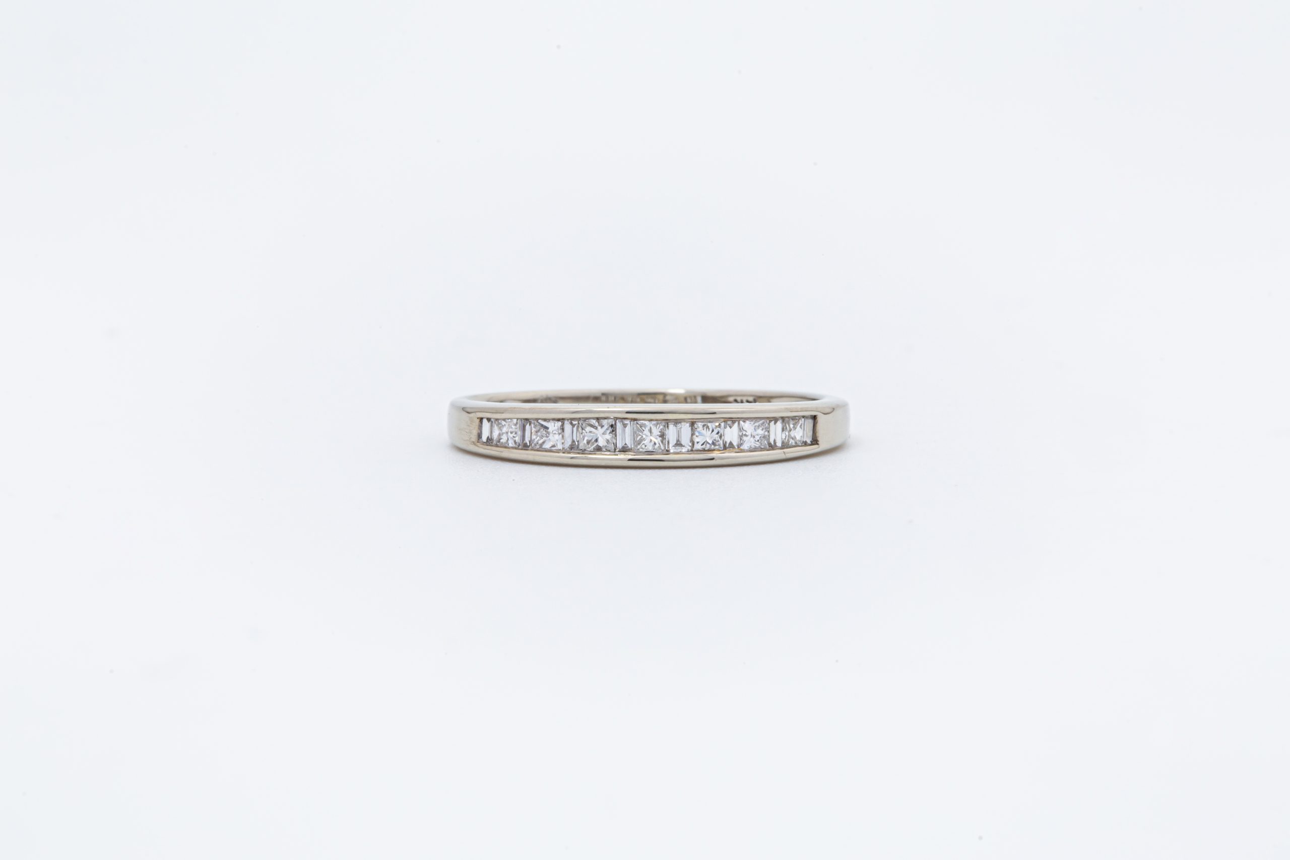 Esta churumbela en oro blanco 14K combina la elegancia geométrica de los diamantes corte princess y baguette, logrando un diseño sofisticado, moderno y perfectamente equilibrado. Con un total de 30 puntos en diamantes, cada piedra ha sido cuidadosamente engastada para crear un juego de luz refinado y continuo.